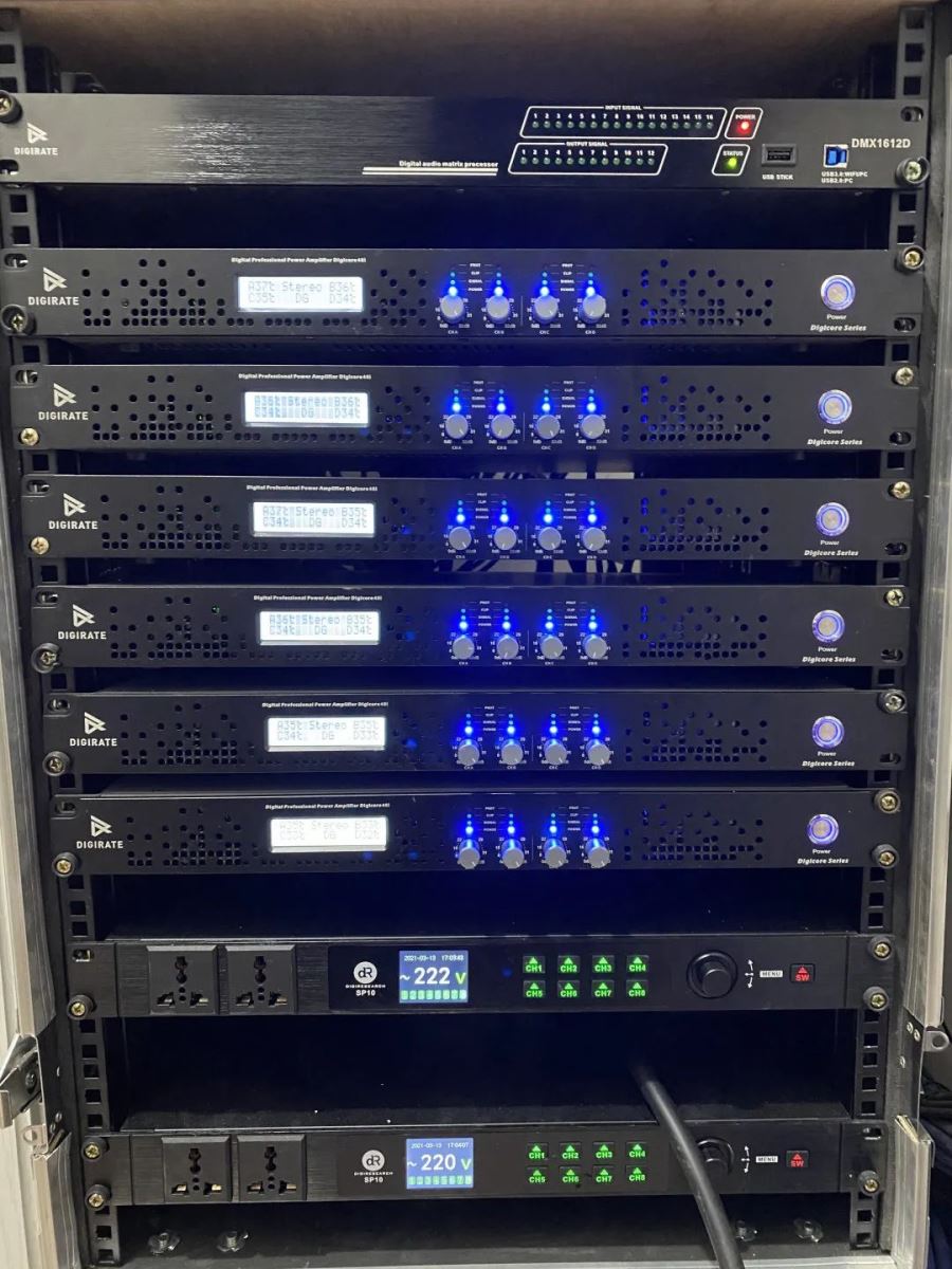 音頻處理系統采用了DIGIRATE(迪吉瑞)數字音頻處理器:DMX1612D系列數字功放DIGICORE系列以及大量樂器話筒