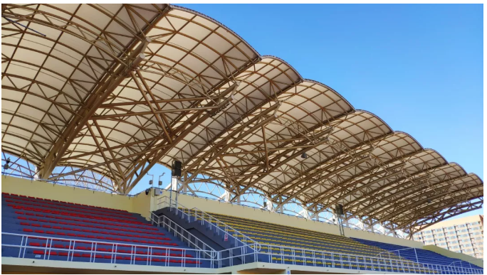 由于該體育場為改造項目,建設方無法提供音箱在頂棚安裝的條件,因此只能訂做安裝結(jié)構(gòu)進行安裝。