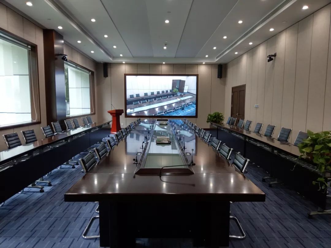 大績效會議室長14.56m、寬6.8m、高3.5m,面積約99㎡,可容納坐席52個,主要用于產業集團績效回顧會、集團大會主會場等會議場景。