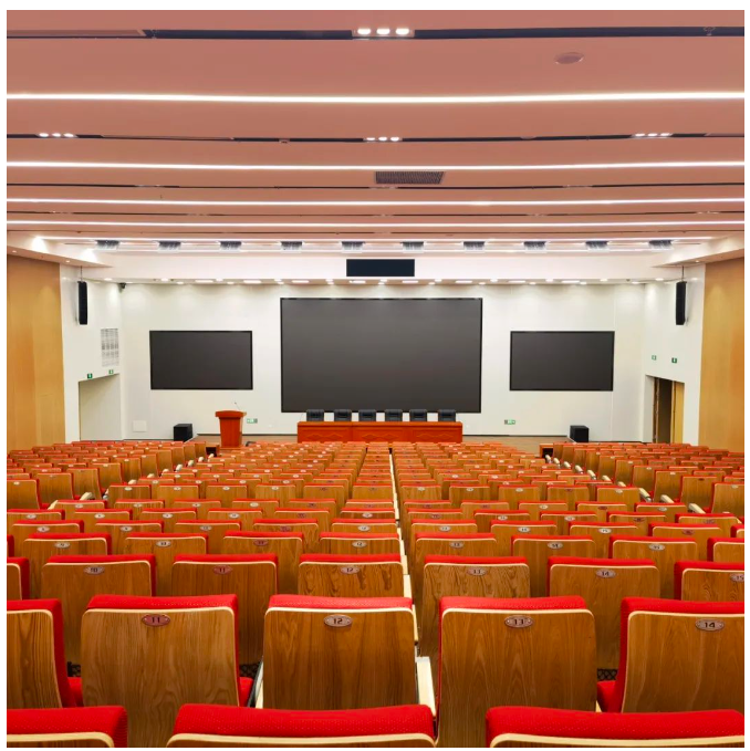 學校高度重視高水平科技創新平臺建設,力求將其作為打造國家戰略科技力量的重要抓手,這一目標同時體現在科研樓學術報告廳項目中。 重慶醫科大學科研樓學術報告廳擴聲系統由德國SEEBURG acoustic line (SAL聲愛樂)和西班牙RAM audio打造,自主品牌DIGIRATE迪吉瑞為其配備高效穩定的數字會議系統,以滿足召開各類會議、學術討論、演講、報告、新聞發布、多媒體教學培訓、觀看電影等活動需求,大大提高學校教學質量與師生文娛活動水平。 主擴是由兩個GL8c與4個GL8i組成的柱體式線性陣列揚聲器,僅19厘米寬的箱體,也能保證高清晰度聲音還原和高質量音樂重放,非常適合如報告廳這種需要遠距離傳播的環境中使用,最終效果讓人滿意。 搭配2只Galeo S Sub大功率超低頻音箱,12個A1全頻揚聲器組成環繞聲道,豐富的聲音層次感增加了聽者臨場體驗感,舞臺返送則由4只A4全頻揚聲器擔任,所有音響均由RAM audio Z系列功放驅動。
