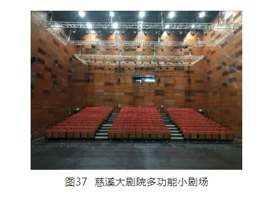 慈溪大劇院多功能小劇場由浙江大學(xué)聲學(xué)研究所負(fù)責(zé)建筑聲學(xué)設(shè)計(jì),場地頂面采用全開放形式,排布了用于吊掛各種揚(yáng)聲器、燈光設(shè)備的桁架,墻面采用面塊板作縱橫經(jīng)緯的分割,內(nèi)襯吸聲棉,建聲條件較好,廳堂固有中頻(500 Hz)混響時間的最終測量結(jié)果為1 s。此項(xiàng)目的電子聲學(xué)環(huán)境可變系統(tǒng)也選用了E-Coustic系統(tǒng),因?yàn)檎麄€空間為全開放式,所以,舞臺和觀眾席做了一體的聲學(xué)優(yōu)化設(shè)計(jì)。整套系統(tǒng)總共使用了4支傳聲器和54只揚(yáng)聲器,傳聲器選型與上述威海群藝館海洋劇場案例相同,分別吊裝于舞臺前方和中部的上空,以拾取舞臺任意位置的聲源。舞臺電子反聲罩系統(tǒng)共使用了23只揚(yáng)聲器,觀眾席則共安裝了31只揚(yáng)聲器,其中包括天花吊掛的6只超低揚(yáng)聲器,所有揚(yáng)聲器均采用明裝方式,如圖37所示。