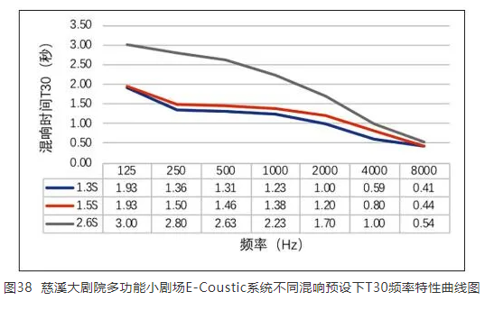 此項(xiàng)目在原有聲學(xué)條件的基礎(chǔ)上,最終調(diào)試完成并交付使用時共設(shè)有6種預(yù)設(shè)模式,其中Nice room模式下,E-Coustic系統(tǒng)主要用于早期反射聲的增強(qiáng),只加入了少量的混響聲能,使得廳堂在此模式下,擁有更高聲能量以及聲場均勻度,因此,同時提升了語言清晰度,適合會議、講座等場景使用。此外幾種模式的混響時間預(yù)設(shè)分別為1.3 s、1.5 s、2.6 s等,這些模式均可根據(jù)多功能小劇場不同的使用場景,通過觸摸式操作面板來進(jìn)行切換。本項(xiàng)目調(diào)試階段特地邀請了上海交響樂團(tuán)的弦樂四重奏來模擬正式演出場景,通過開閉電子聲學(xué)環(huán)境可變系統(tǒng)的對比評價,演奏者反饋聲學(xué)環(huán)境變化十分明顯,加載本系統(tǒng)后演奏中的廳堂感和交互感有了明顯的提升。本廳堂加載三種不同混響時間預(yù)設(shè)模式的T30實(shí)地測量結(jié)果如圖38。