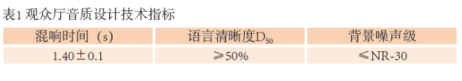 依據劇場規模和容積,并參考相關技術標準[1]確定劇場觀眾廳音質設計目標值,如表1所