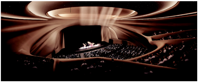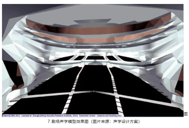 體型設計是建聲設計的基礎,因為反射聲的方向和能量分布主要依賴于墻面及頂面的體型設計。但作為以擴聲演出為主的廳堂,演出時聲音主要來源于揚聲器系統,因此,建聲設計在體型設計方面主要是在滿足室內視覺效果的同時避免各種聲學缺陷的產生。圖4和圖5分別為建筑設計師提供的不同視角的原創室內效果圖。