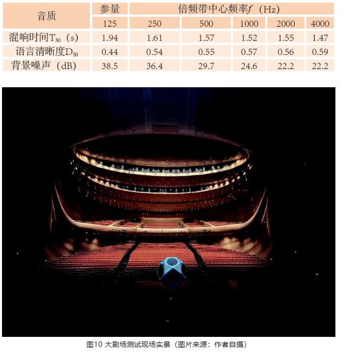 2022年9月28日,筆者帶領團隊依據相關技術標準[2,3]的要求對平潭國際演藝中心大劇場進行了音質參量的空場測試,結果如表3所示,圖10所示為測試現場實景。