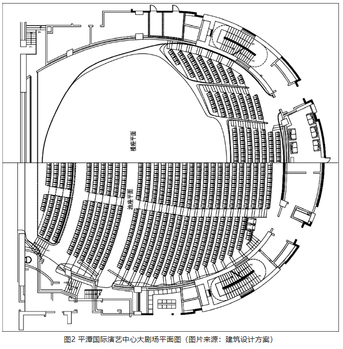 平潭國際演藝中心位于福建省平潭綜合實驗區,面朝開闊的海灣景觀。建設用地面積約31 374.21 m2,建設總建筑面積 3 8 9 7 2 . 8 7 m 2 ,其中地上建筑面積26 907.21 m2,包含大劇場、多功能廳、公共文化中心和公共服務配套等,地下建筑面積12 065.55 m2。大劇場及多功能廳配置了先進的聲光電設備,同時,這兩個廳堂也都進行了專業的建筑聲學設計。先進的舞臺設備及優良的建聲設計,使得平潭國際演藝中心完全可以滿足國內外大型歌劇、舞劇、綜藝、話劇、戲曲等節目的演出需求。平潭國際演藝中心的建成投用,提升了平潭國際旅游島的知名度和影響力,也將對兩岸文化藝術交流與合作發揮重要的促進作用。圖1為平潭國際演藝中心效果圖。