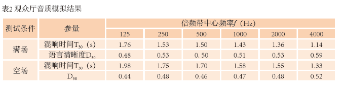 從表2可知,計算機模擬的各個聲學參量均在設計要求范圍內。這說明經過多輪的調整優化,最終確定的觀眾廳的體型以及材料均是合適的。