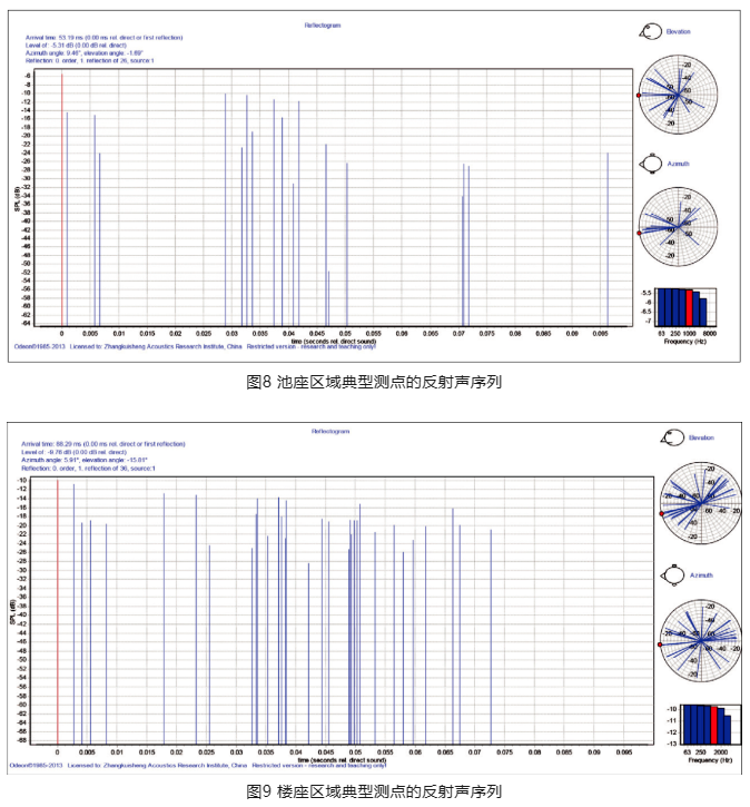 反射聲序列對音質效果也是有一定影響的,圖8和圖9分別為池座和樓座典型測點的反射聲序列圖。從測點反射聲序列的模擬結果看,廳內反射聲也比較合理,前50 ms內也有一定數量的反射聲。