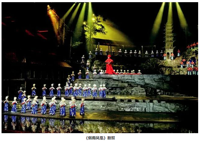 其實,這個方法之前也曾多次使用。不過這次的實踐讓筆者發(fā)現(xiàn),很多情況下聲音的獨特效果可以根據(jù)舞美場景,甚至利用舞美裝置的特性來實現(xiàn)。這一點以后也可以繼續(xù)跟音響師們研究探討,從中發(fā)現(xiàn)、挖掘并再現(xiàn)出契合戲劇創(chuàng)意的聲音效果。例如,國外有的錄音棚用老教堂或者工廠廠房改造,以得到想要的聲音效果,包括好萊塢的電影錄音。這具有無限拓展的可能性,因為每一種聲音在不同的空間都會是不同的,關(guān)鍵也在于音響師是否有主觀創(chuàng)新的想法,畢竟對于多數(shù)戲劇音響設計來說,音響師首先要保證的是戲劇對聲音的基本要求,然后才是個性化需求。另外,音響師對舞美空間的解讀也尤為重要,舉個例子,幾年前參加湖南鳳凰的《煙雨鳳凰》實景演出項目的舞美設計,景的縱深有50 m多,一側(cè)是用于造景的山,一側(cè)是吊腳樓,中間風雨橋作為兩者的連接,遠處縱深就是利用實景的山和樹林。該劇的音響師就根據(jù)這樣一個悠遠的空間環(huán)境,制造從左到右的聲像差,形成由遠及近的聲音效果,的確讓觀眾感受到了空間距離上聲音傳遞效果,十分契合舞美所營造出的氛圍。